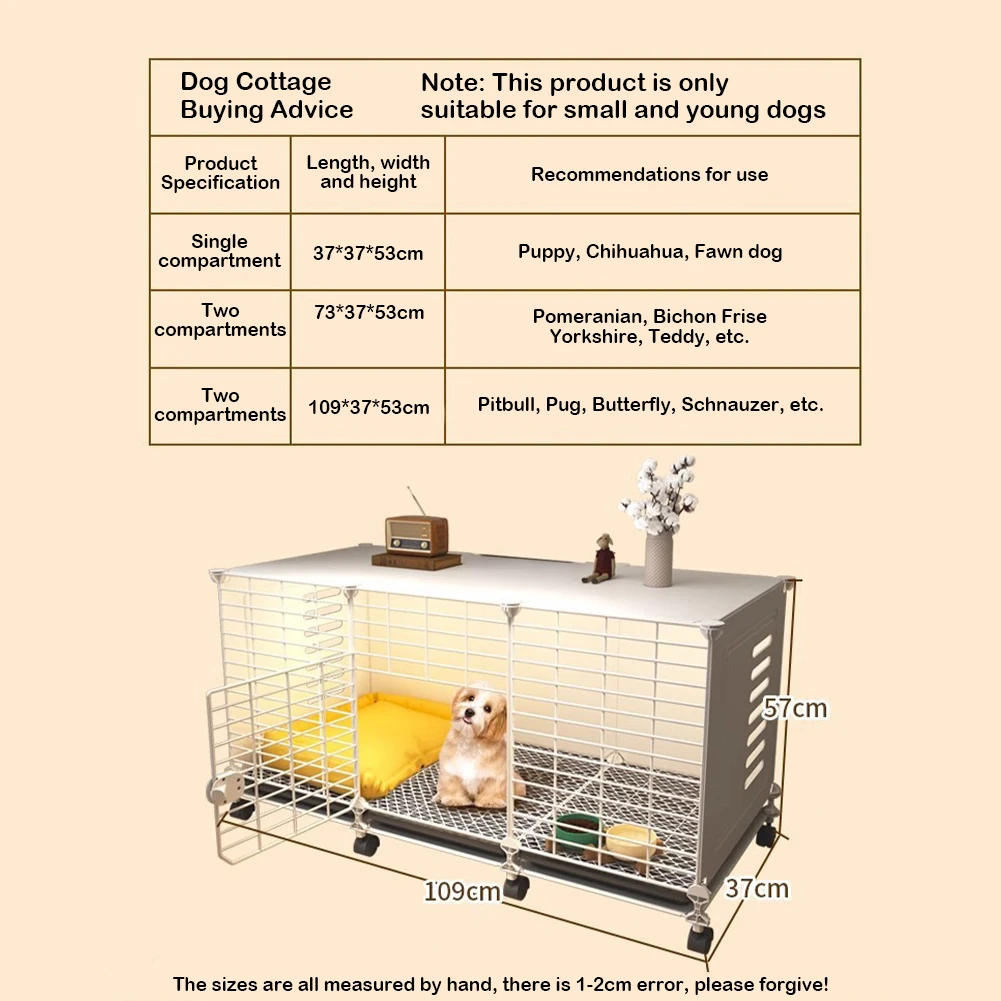 | Dog Crate End Table with Wheels & Tray Indoor Dog House Wired Cage Crate Dog Kennels Wire Dogs Kennel for Small/Medium/Large Dog Feature: 1.Stylish Furniture Design: This Dog Crate End Table combines a pet home and stylish furniture, fitting seamlessly into your home decor. The spacious design offers ample room for your pet's comfort, making it a choice for small dogs. 2.Construction: Built with high-quality materials, this dog kennel provides a sturdy and secure environment. Its design ensures long-lasting durability, withstanding your pet's everyday activity while keeping them safe. 3.Easy Access & Ventilation: With wire dogs kennel panels, this pet crate ensures excellent airflow and visibility for your pet. It features an easy-to-open door for convenient access, making it simple to feed or interact with your pet. 4.Multi-Functional Use: This versatile indoor dog house serves as both a secure pet enclosure and an end table. Use it as a functional piece of furniture while providing a cozy space for your pet to rest comfortably. 5.Quick Assembly: Designed for easy setup, this dog cage crate includes clear instructions for hassle-free assembly. Spend less time building and more time enjoying moments with your furry companion. Specification: Origin: Mainland China Product size: 1090.00x370.00x670.00mm Product size: 42.91x14.57x26.38inch Material: Plastic Note: 1 x Dog Crate 1 x Tray |